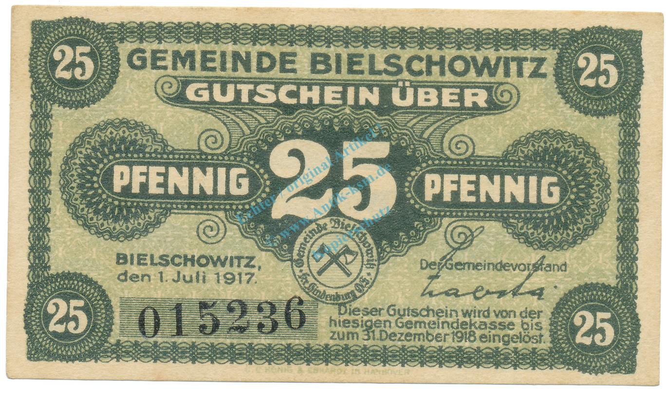 Bielschowitz , Notgeld 25 Pfennig Schein unc-kfr. Ti.0625.05.15 SLN 1917 Verkehrsausgabe -4248-