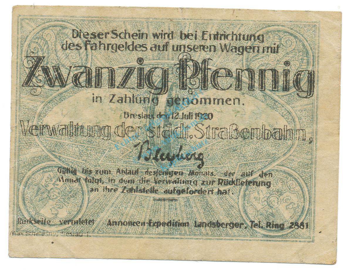 Breslau , Notgeld 20 Pfennig Schein gbr. Tieste 0915.120.05 , Schlesien 1920 Verkehrsausgabe -4054-
