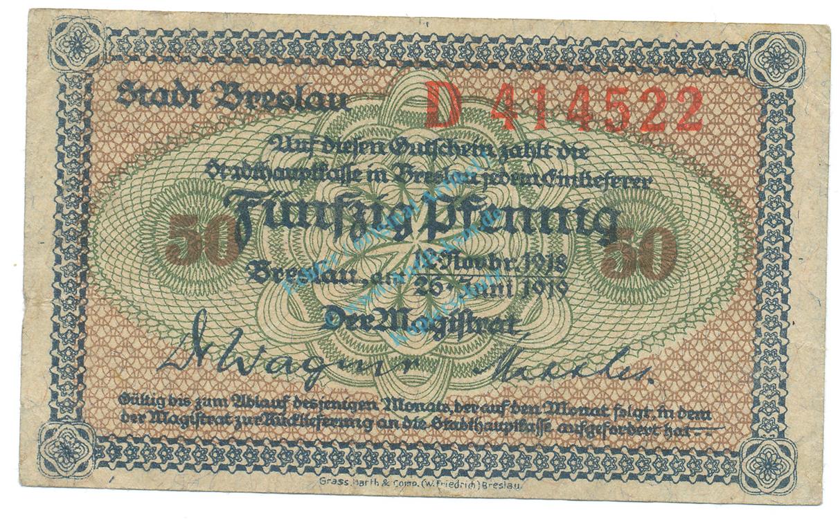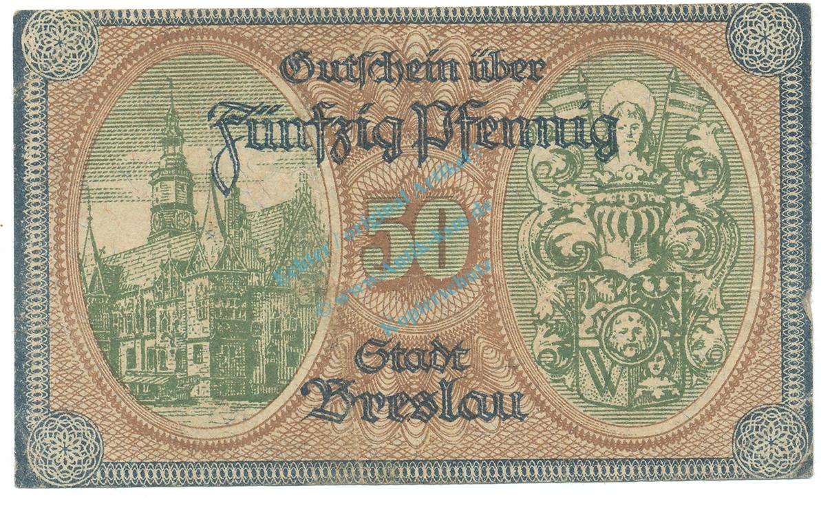 Breslau , Notgeld 50 Pfennig Schein -D- gbr. Ti.0915.115.20 , SLN 1918 Verkehrsausgabe -4221-