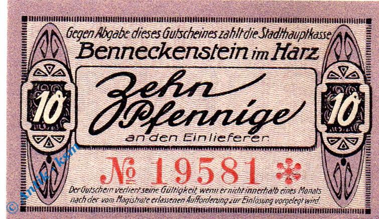 Notgeld Benneckenstein , 10 Pfennig Schein , Tieste 0405.05.02 , von 1919 , Sachsen Verkehrsausgabe