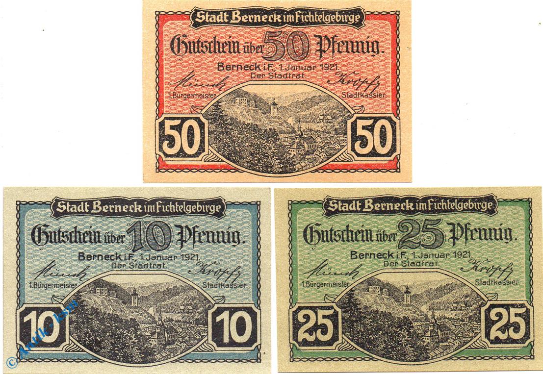 Notgeld Berneck , Set mit 3 Scheinen , Groß- und Kleinbuchst. Tieste 0540.05.55 bis 57 , von 1921 , Bayern Verkehrsausgabe