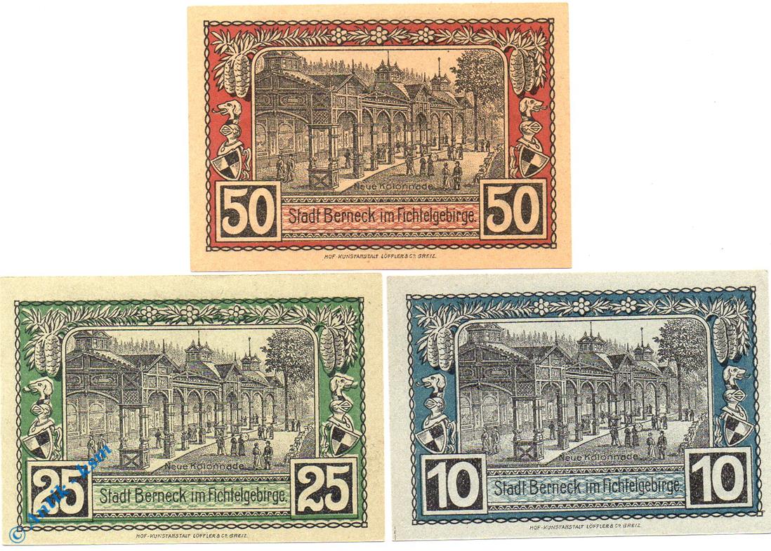 Notgeld Berneck , Set mit 3 Scheinen , nur Großbuchst. Tieste 0540.05.50 bis 52 , von 1921 , Bayern Verkehrsausgabe