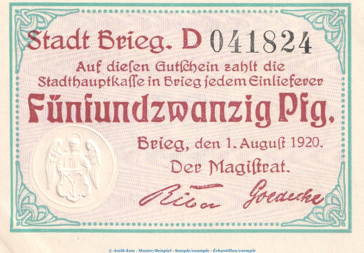 Notgeld Stadt Brieg 0930.15.10 , 25 Pfennig Schein in kfr. von 1920 , Schlesien Verkehrsausgabe