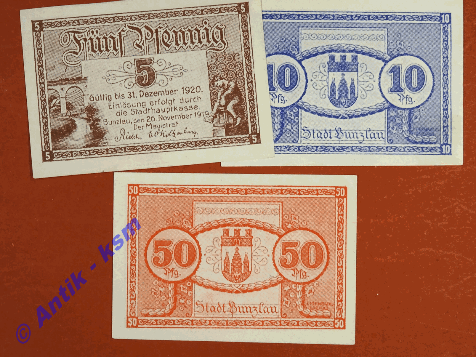 Notgeld Bunzlau , vollständiger Satz mit 3 Scheinen , Tieste 1025.20 - 22 , von 1919 , Schlesien Verkehrsausgabe