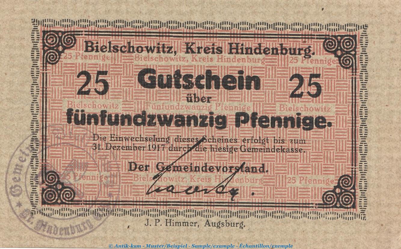 Gutschein / Banknote der Gemeinde Bielschowitz , Verkehrsausgabe