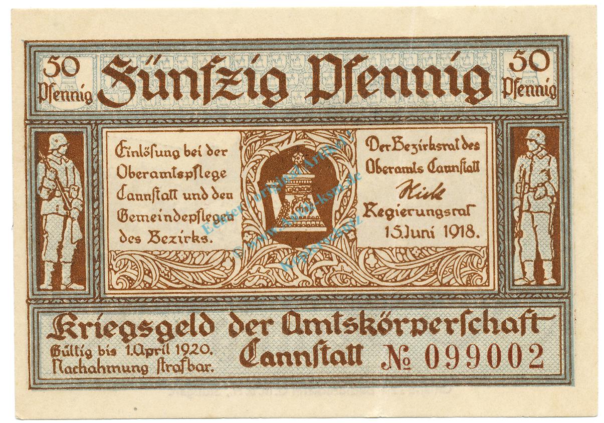 Cannstatt , Notgeld 50 Pfennig Schein unc-kfr. Tieste 1085.05.05  , WÜR 1918 Verkehrsausgabe -4110-