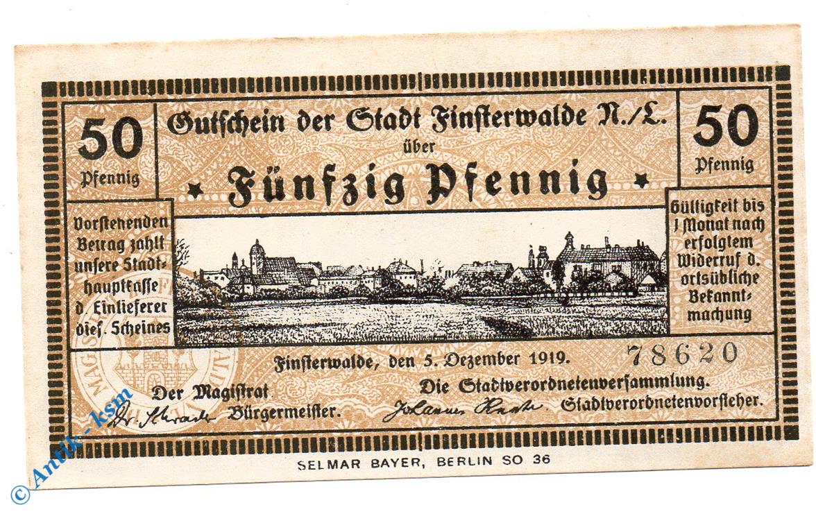 Notgeld Finsterwalde , 50 Pfennig Schein , druck schwarz , Tieste 1870.05.03 , von 1919 , Brandenburg Verkehrsausgabe