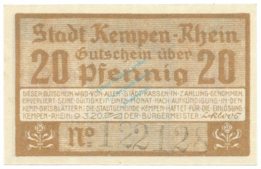 Kempen , Notgeld 20 Pfennig Schein unc-kfr. Tieste 3460.05.15 , RHL 1920 Verkehrsausgabe -4059-