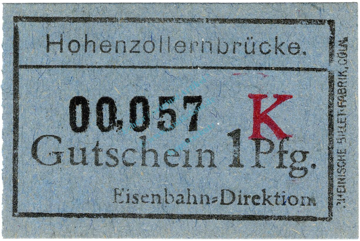 Köln , Notgeld 1 Pfennig -Hohenzollernbrücke- in unc-kfr. Ti.3565.040.40 , Rheinland o.D. Verkehrsausgabe