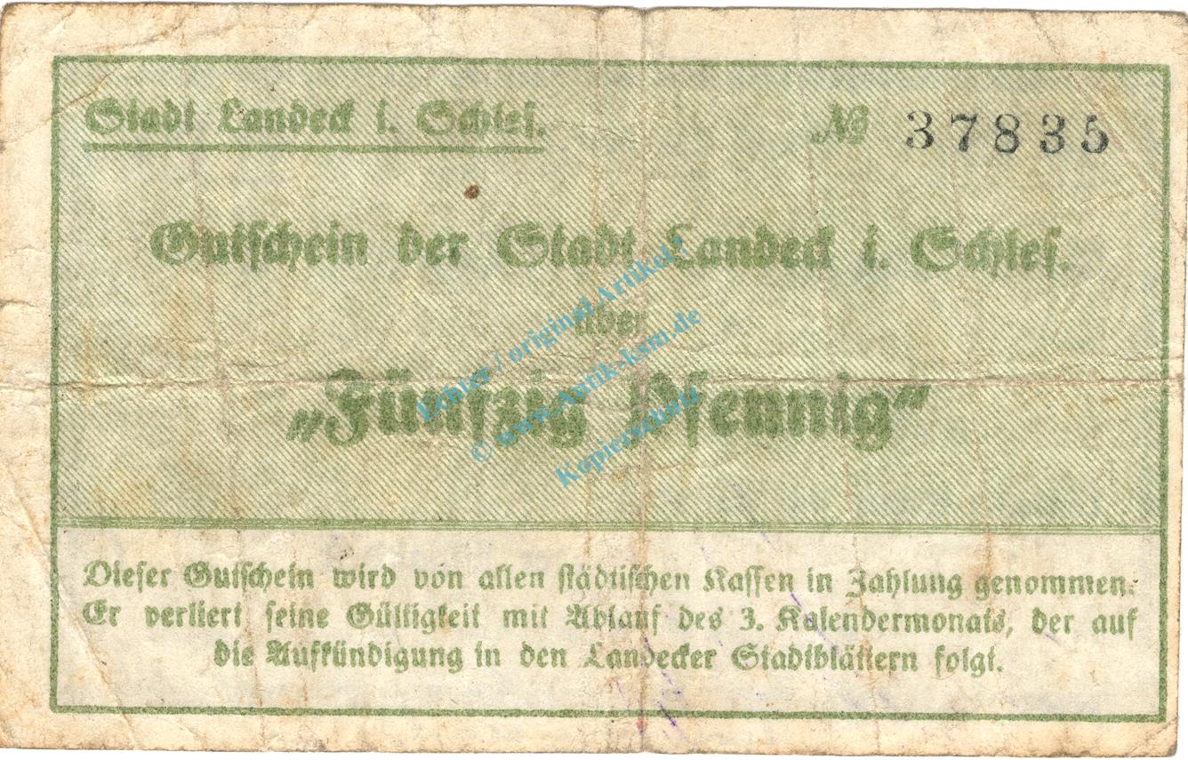 Landeck , Notgeld 50 Pfennig Schein gbr. Ti.3825.10.11 , Schlesien 1920 Verkehrsausgabe