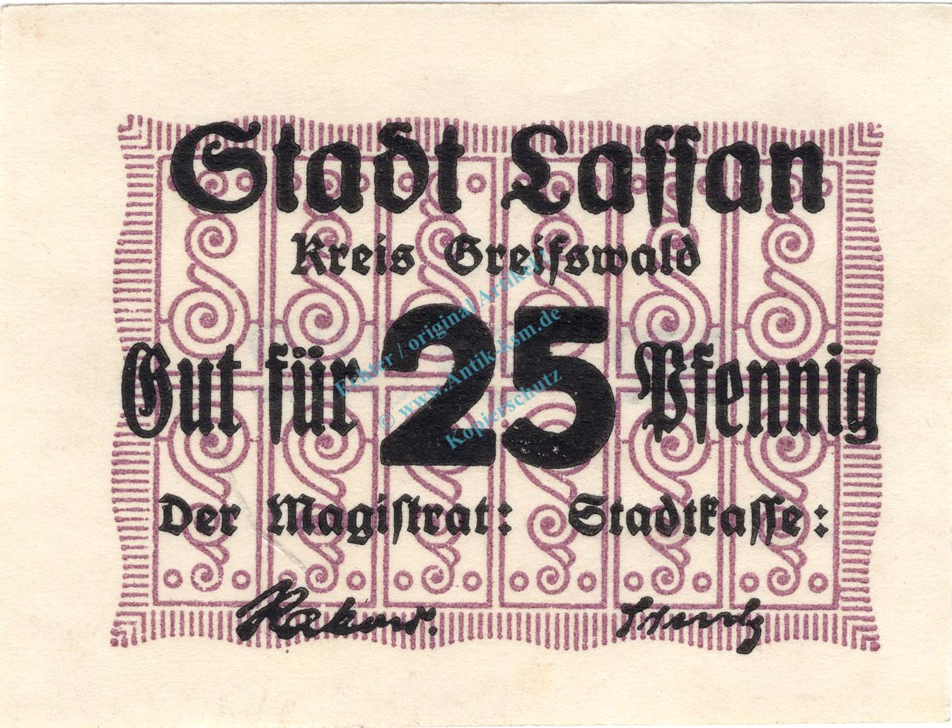 Lassan , Notgeld 25 Pfennig Schein unc-kfr. Ti.3890.10.11 , Pommern o.D. Verkehrsausgabe