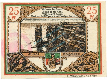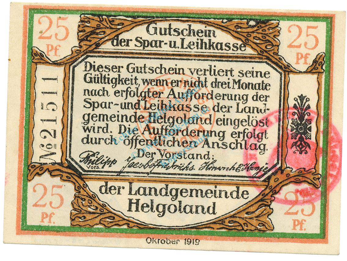Helgoland , Notgeld 25 Pfennig -2 Stempel- unc-kfr. Tieste 2915.10.50.B , SH 1919 Verkehrsausgabe -4058-