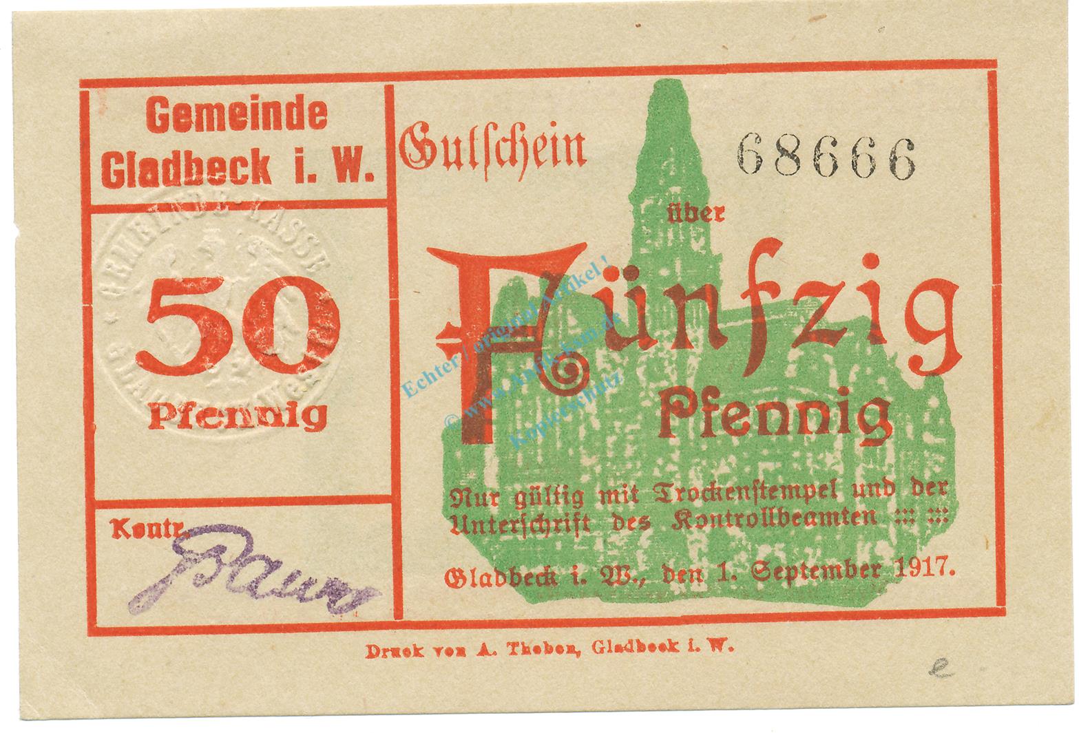 Gladbeck , Notgeld 50 Pfennig Schein unc-kfr. Tieste 2240.05.30 , Westfalen 1917 Verkehrsausgabe