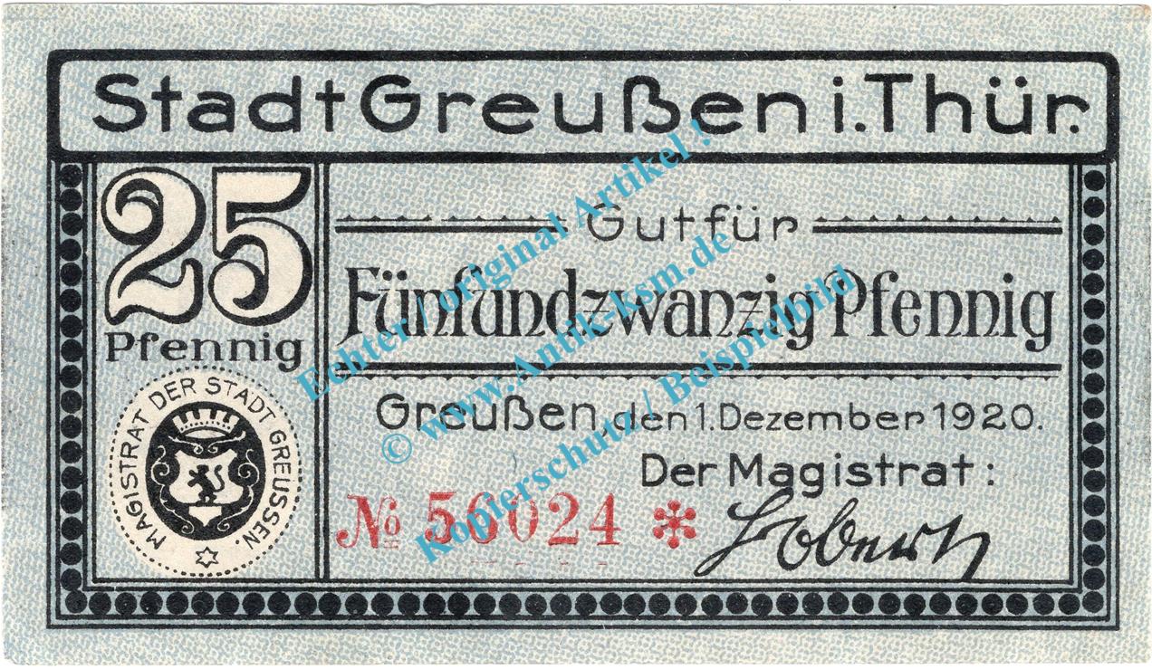 Greussen , Notgeld 25 Pfennig Schein in kfr. Tieste 2455.05.05 , Thüringen 1920 Verkehrsausgabe