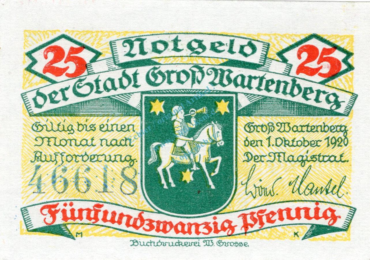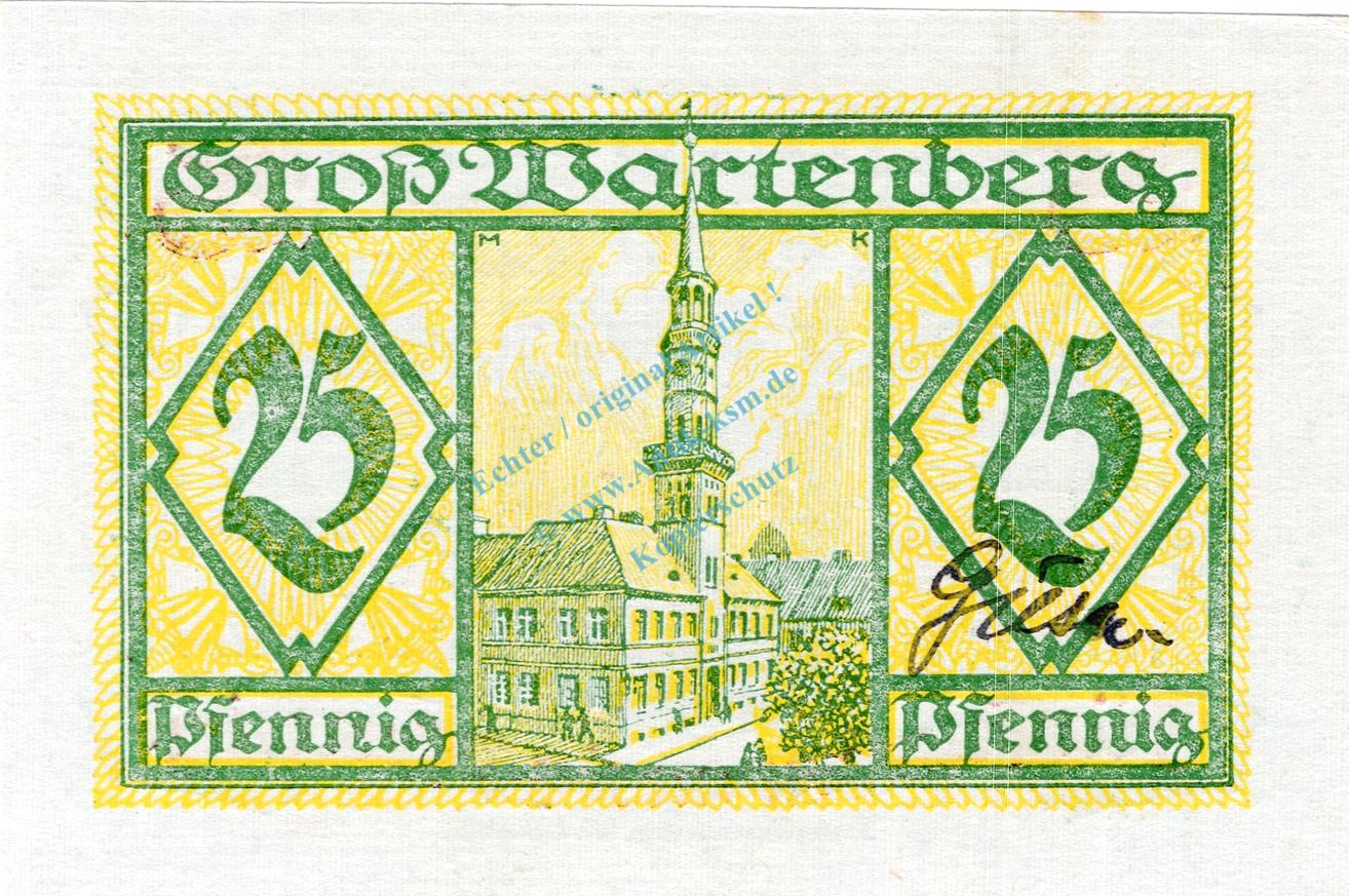 Gross Wartenberg , Notgeld 25 Pfennig Schein unc-kfr. Ti.2615.10.01 Schlesien 1920 Verkehrsausgabe