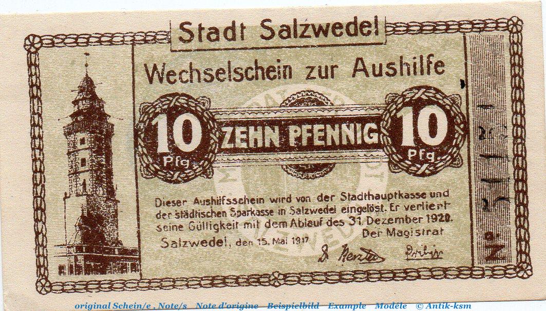 Notgeld Stadt Salzwedel 6375.10.56 , 10 Pfennig Schein in kfr. von 1917 , Sachsen Anhalt Verkehrsausgabe