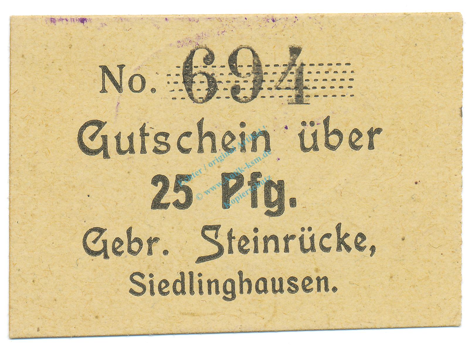 Siedlinghausen , Notgeld 25 Pfennig Schein unc-kfr. Tieste 6880.25.15 , Westfalen o.D. Verkehrsausgabe