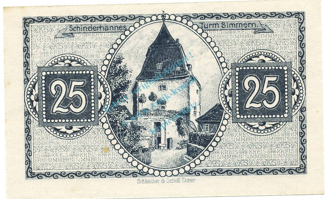 Simmern , Notgeld 25 Pfennig Schein unc-kfr. Ti.6925.05.10 RHL 1919 Verkehrsausgabe -4314-