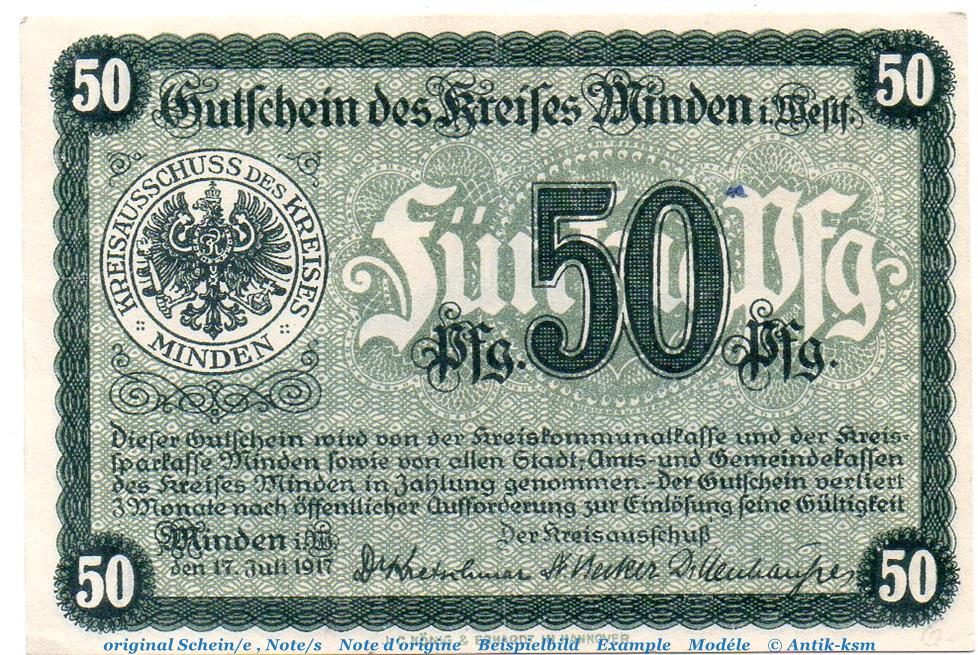 Notgeld Kreis Minden 4575.05.03 , 50 Pfennig Schein in kfr. von 1917 , Westfalen Verkehrsausgabe