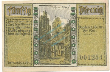 Parchim , Notgeld 50 Pfennig Schein unc-kfr. Tieste 5500.05.15 , MVS 1921 Verkehrsausgabe -4143-