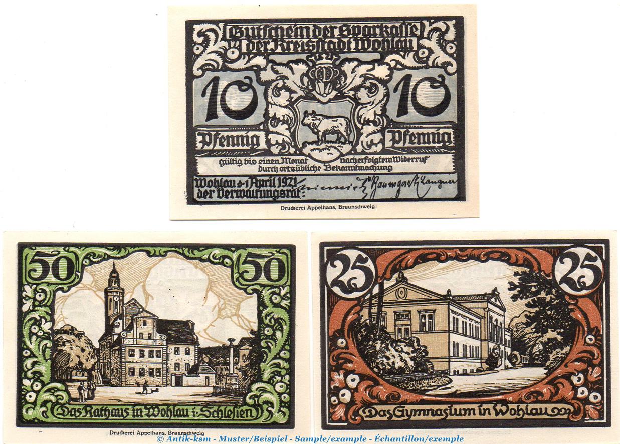 Notgeld Stadt Wohlau 8050.05.05-07 , Set mit 3 Scheinen in kfr. von 1921 , Schlesien Verkehrsausgabe