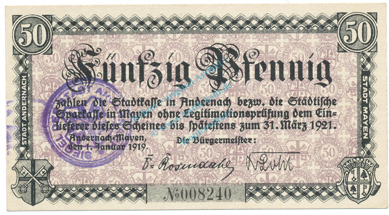 Antik-ksm - Andernach , Notgeld 50 Pfennig Schein unc-kfr-. Ti.0125.05.05 , RHL 1919 Verkehrsausgabe -0336-