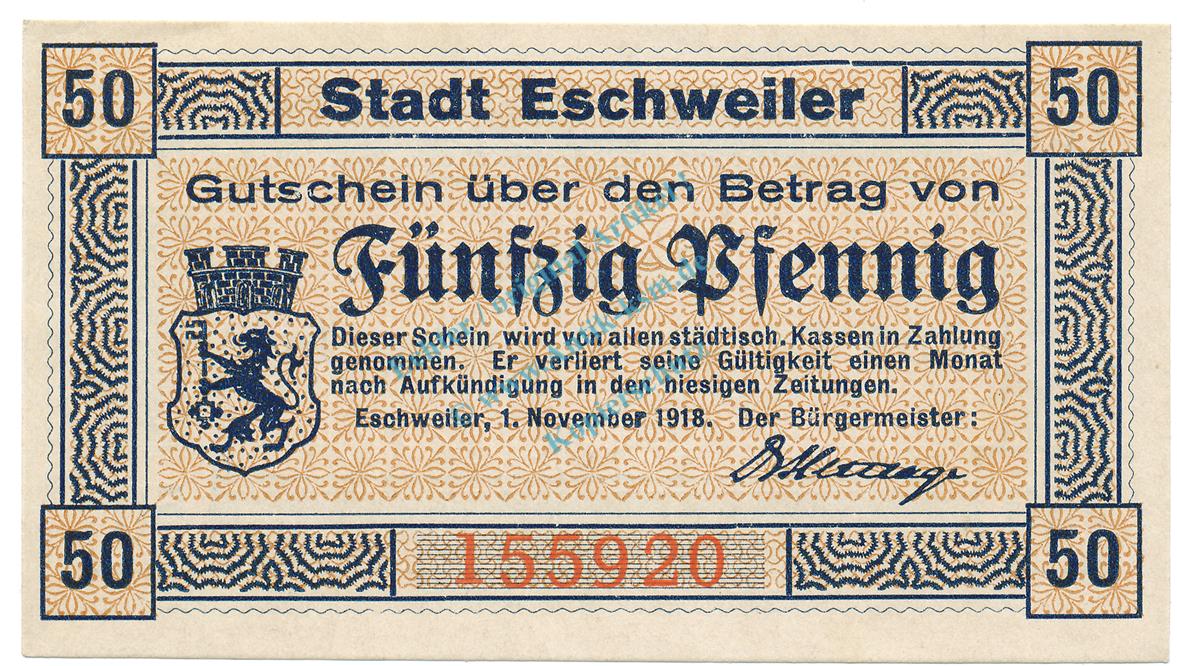 Eschweiler , Notgeld 50 Pfennig Schein unc-kfr. Ti.1790.05.06 , Rheinland 1918 Verkehrsausgabe