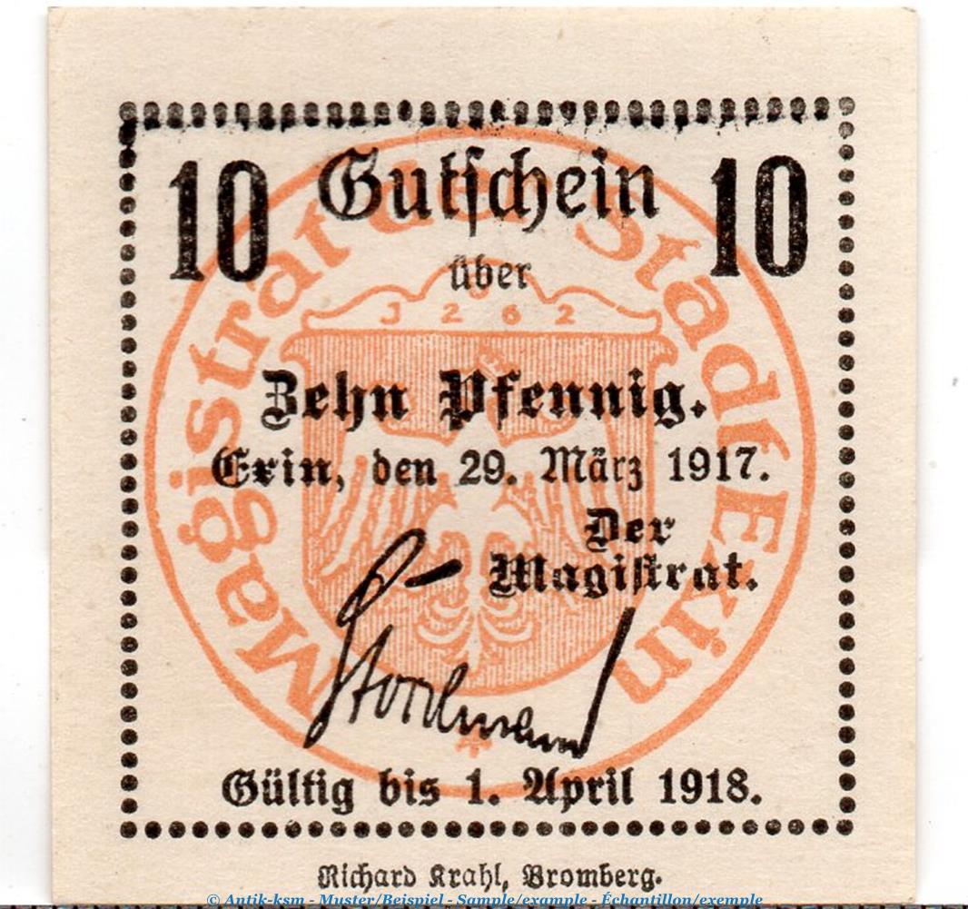 Notgeld Stadt Exin 1830.05.50 , 10 Pfennig Schein in kfr. von 1917 , Posen Verkehrsausgabe
