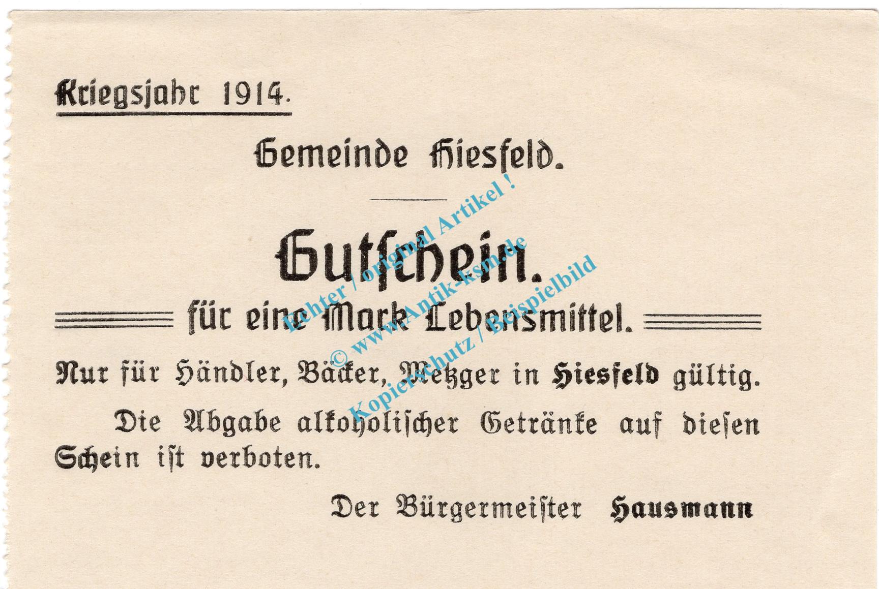 Gutschein / Banknote der Bürgermeister der Gemeinde Hiesfeld , Notgeld 1914/15