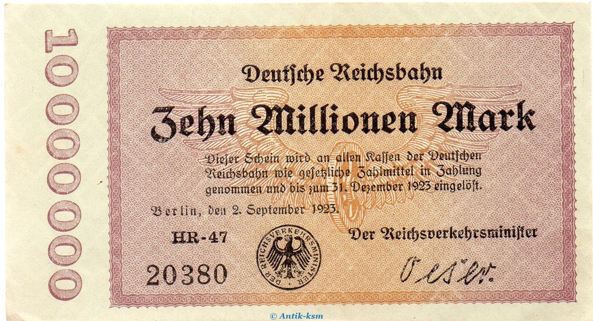 Banknote über Zehn Million Mark von 1923 , Inflation , Deutsche Reichsbahn