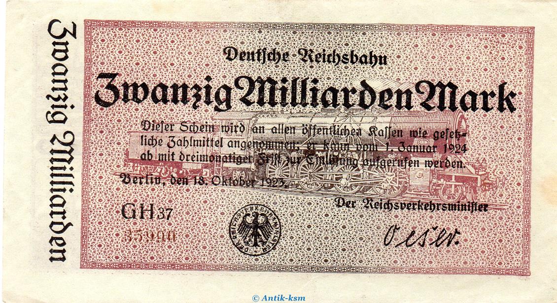 Banknote über Zwanzig Milliarden Mark von 1923 , Inflation , Deutsche Reichsbahn