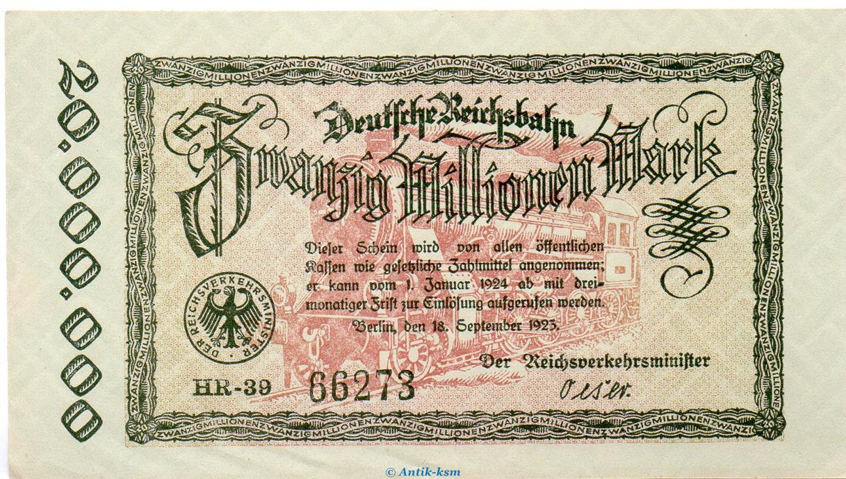 Banknote über Zwanzig Million Mark von 1923 , Inflation , Deutsche Reichsbahn