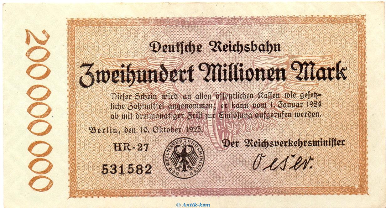 Banknote über Zweihundert Millionen Mark von 1923 , Inflation , Deutsche Reichsbahn