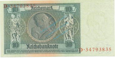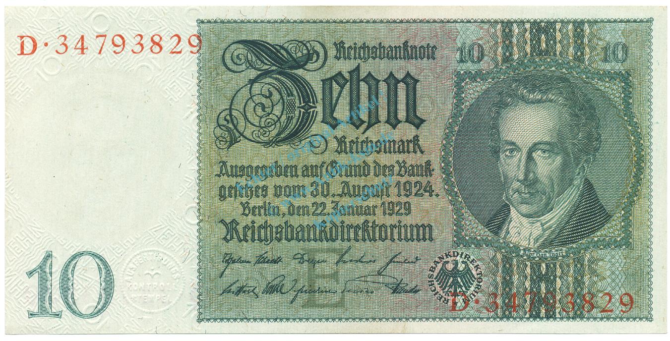 Reichsbanknote , 10 Mark Schein -E 1- in unc-kfr. DEU-183.a, Ros.173, P.180 Weimarer Republik 1929 Reichsbank