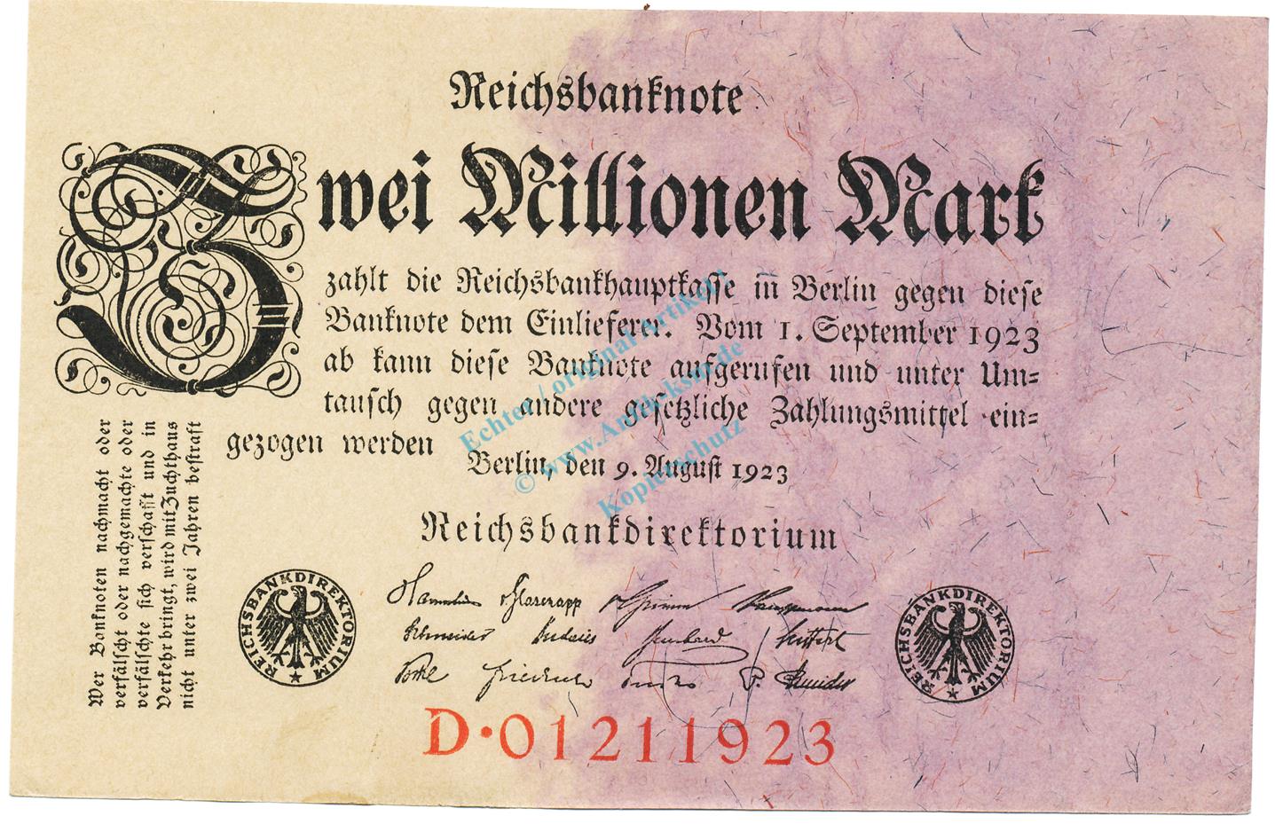 Reichsbanknote , 2 Millionen Mark Schein unc-kfr. DEU-115.a, Ros.102, P.103 Weimarer Republik 1923 Reichsbank