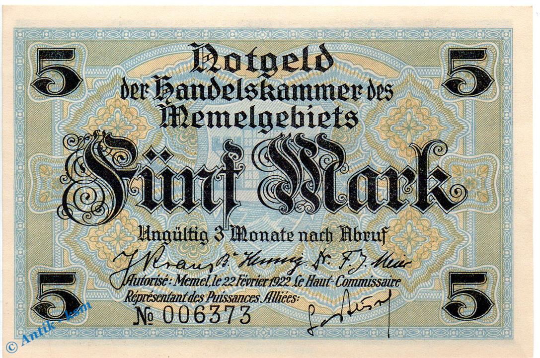 Notgeld Banknote über Fünf Mark von 1922 , deutsche Nebengebiete , Memel