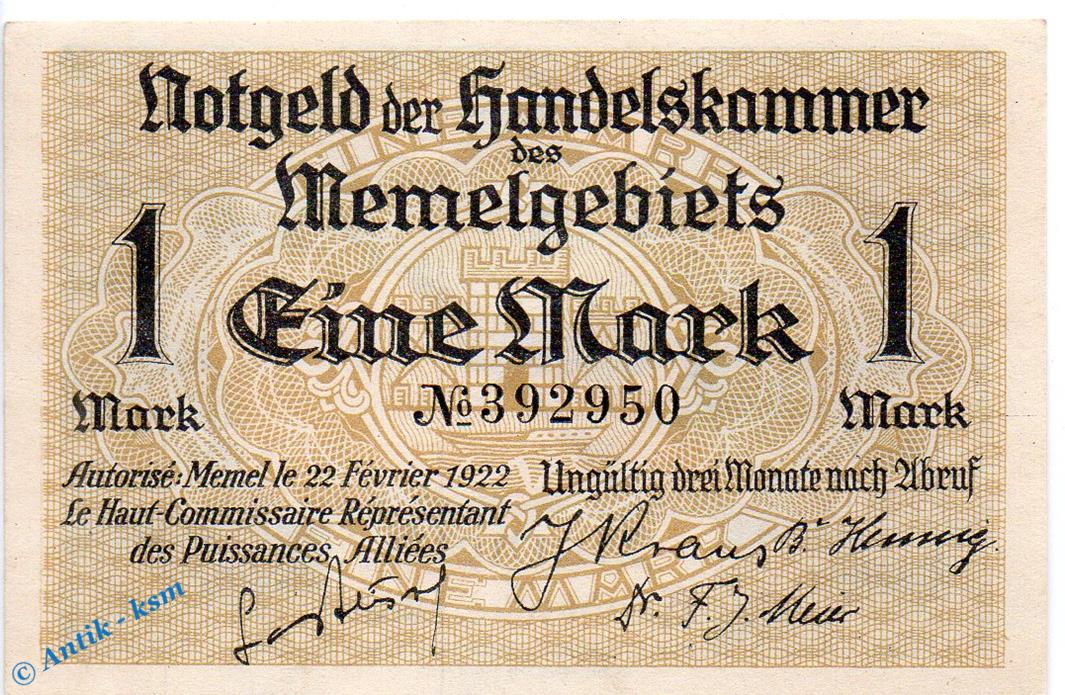 Notgeld , 1 Mark Schein in kfr. Memel , MEM-2 , Rosenberg 847 , P 2 , vom 22.02.1922 , deutsche Nebengebiete