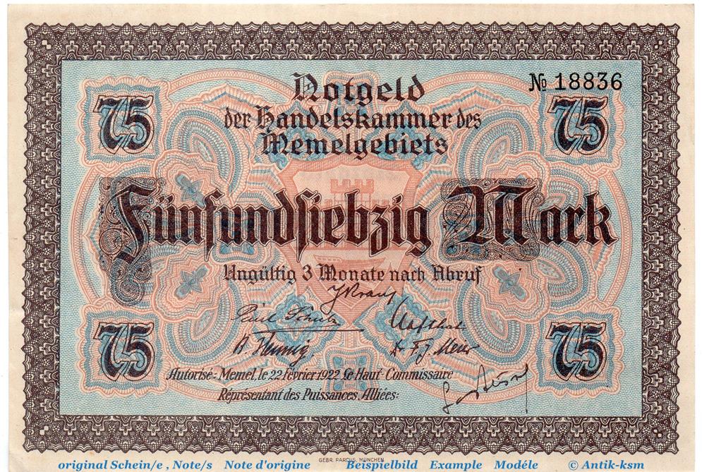 Notgeld , Banknote über Fünfundsiebzig Mark von 1922 , deutsche Nebengebiete , Memel