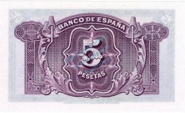 Banknote Spanien , 5 Pesetas Schein 1935 -Woman at left- unc-kfr WPM.85