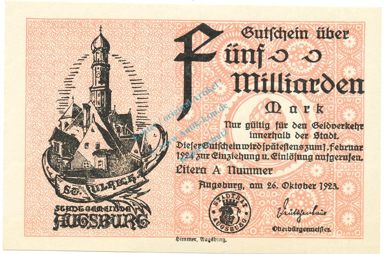 Augsburg , Banknote 5 Milliarden --MUSTER-- unc-kfr. Ke.195.a , BAY 1923 Inflation -3654-