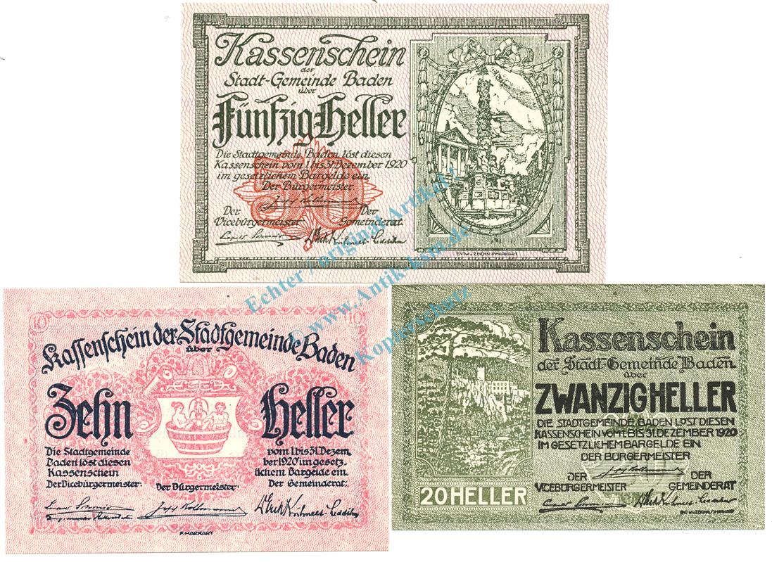 Baden , Notgeld Set 3 Scheine unc-kfr. K-K.74 , o.D. Nieder Österreich -0499-