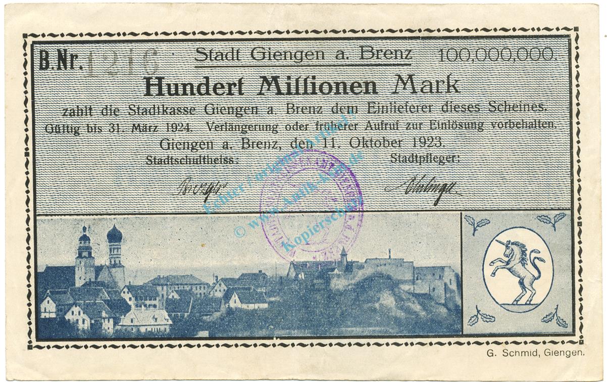 Giengen , Banknote 100 Millionen Mark Schein L-gbr. Ke.1784 , WÜR 1923 Inflation -3668-